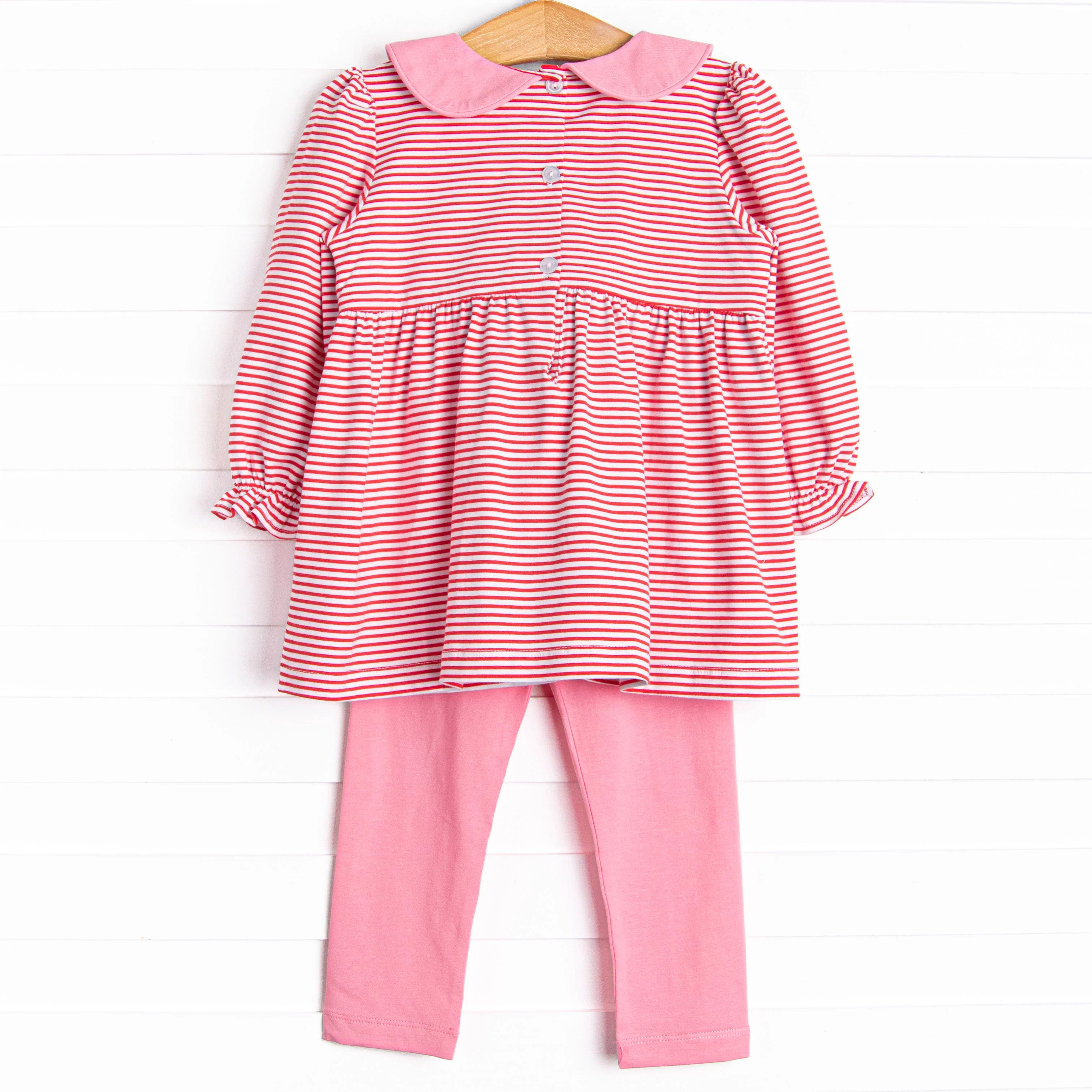 XOXO, Yours Truly! This set features a red striped print, a pink peter pan collar, and XOXO smockings. Coordinating pink leggings to match. This set is sure to steal your heart!